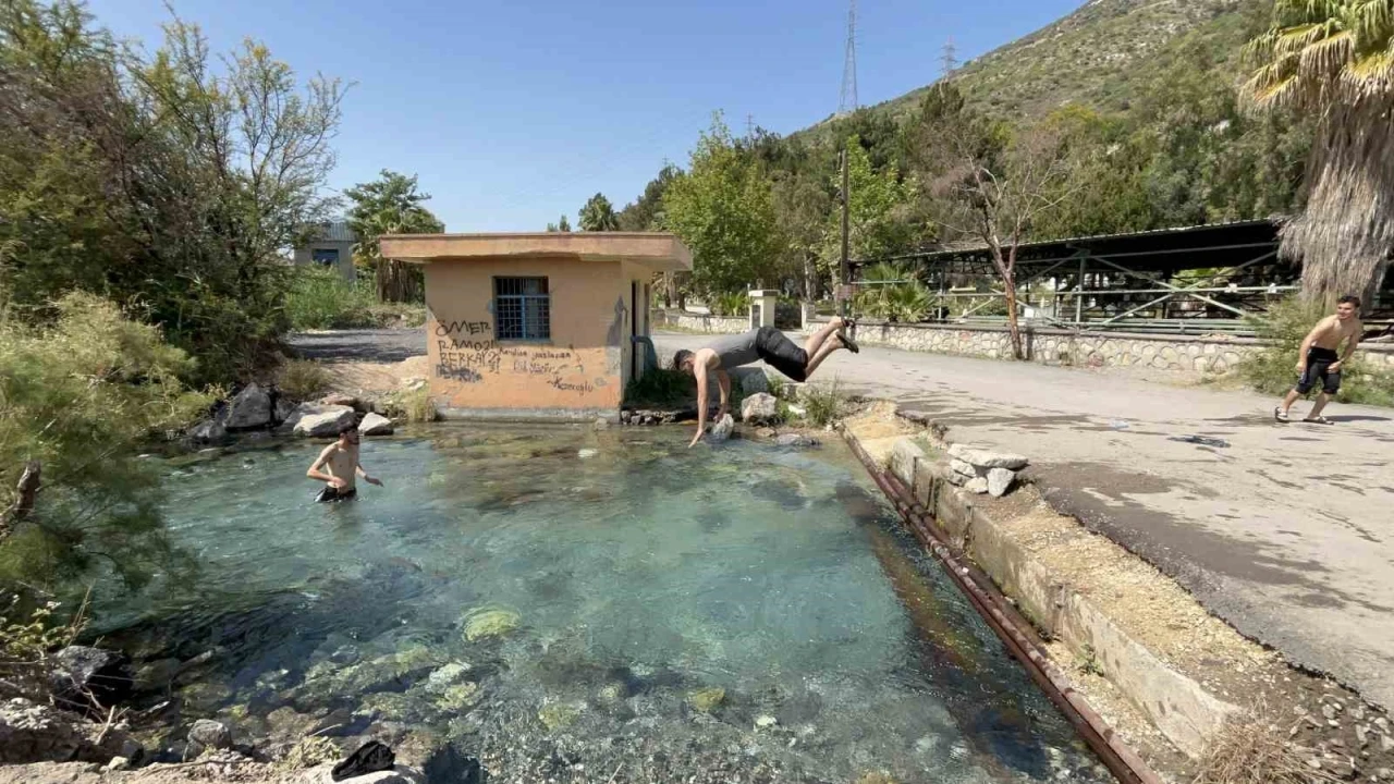 HATAY (İHA) – Hatay’da aşırı sıcaktan kaçan ve bayram tatilini fırsat bilen vatandaşlar, doğal kaynak suyunda yüzerek serinledi.