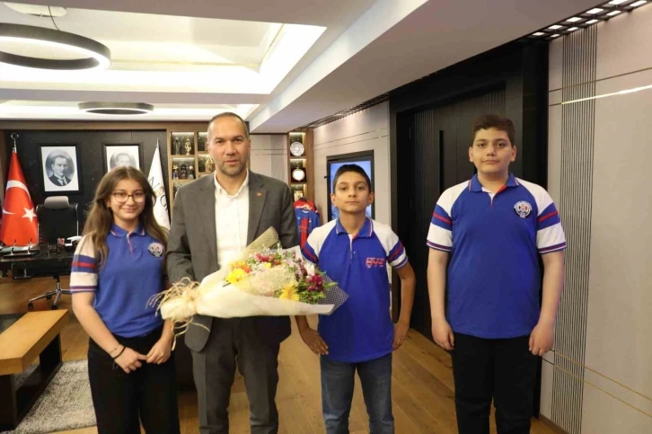 Öğrenciler Ahmet Kerem Çölgeçen, Filiz Ekin Alpkara ve Ahmet Mert gelecekte yapmak istedikleri Belediye Başkanlığı mesleği hakkında Başkan Emrah Özdemir’den bilgi edindi, tecrübelerini dinledi.