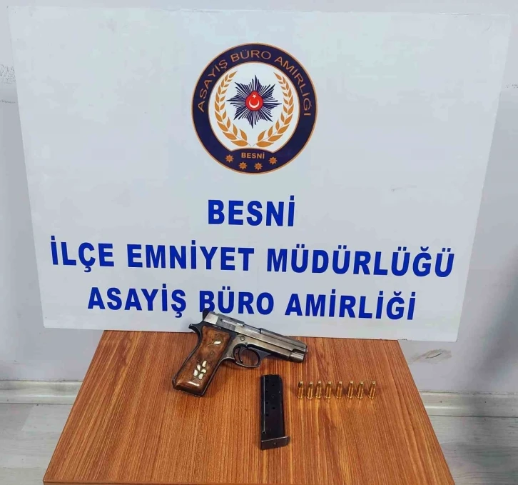 Besni İlçe Emniyet Müdürlüğü ekipleri, Dumlupınar Mahallesi Atatürk Caddesi üzerinde şüphe üzerine durdurulan araçta arama yaptı. Aramada 1 adet tabanca, 8 adet mermi ele geçirildi.