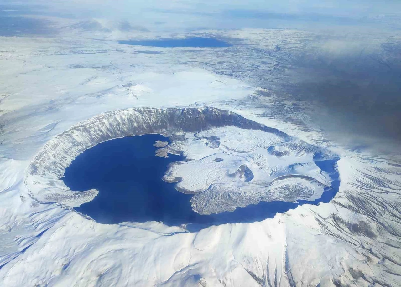 Bitlis’te bulunan ve kar yağışıyla beyaza bürünen Nemrut Dağı ve Krater Gölleri yolcu uçağından havadan görüntülendi.