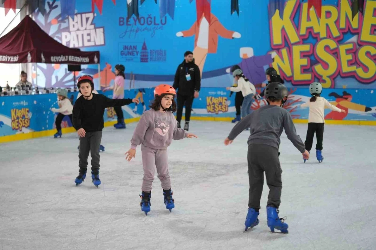 Beyoğlu’nda öğrenciler yarıyıl tatilinin keyfini buz pistinde kayarak çıkardı.
