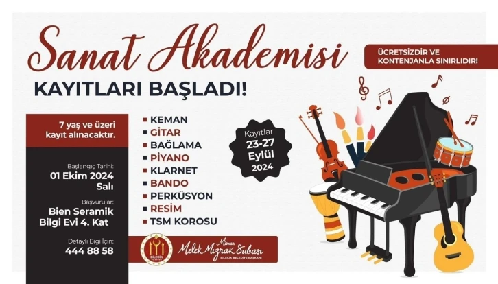 Kurslarda; keman, gitar, bağlama, piyano, klarnet, bando, perküsyon, resim ve Türk Sanat Müziği alanlarında eğitimler verilecek. Bilecik Belediyesi Sanat Akademisi Eğitmenleri tarafından ücretsiz olarak verilecek kurslara kayıtlar kontenjanla sınırlı olacak. 7 yaş ve üzeri kursiyerlerin başvurularının alınacağı Sanat Akademisi kursları 1 Ekim Salı günü başlayacaktır.