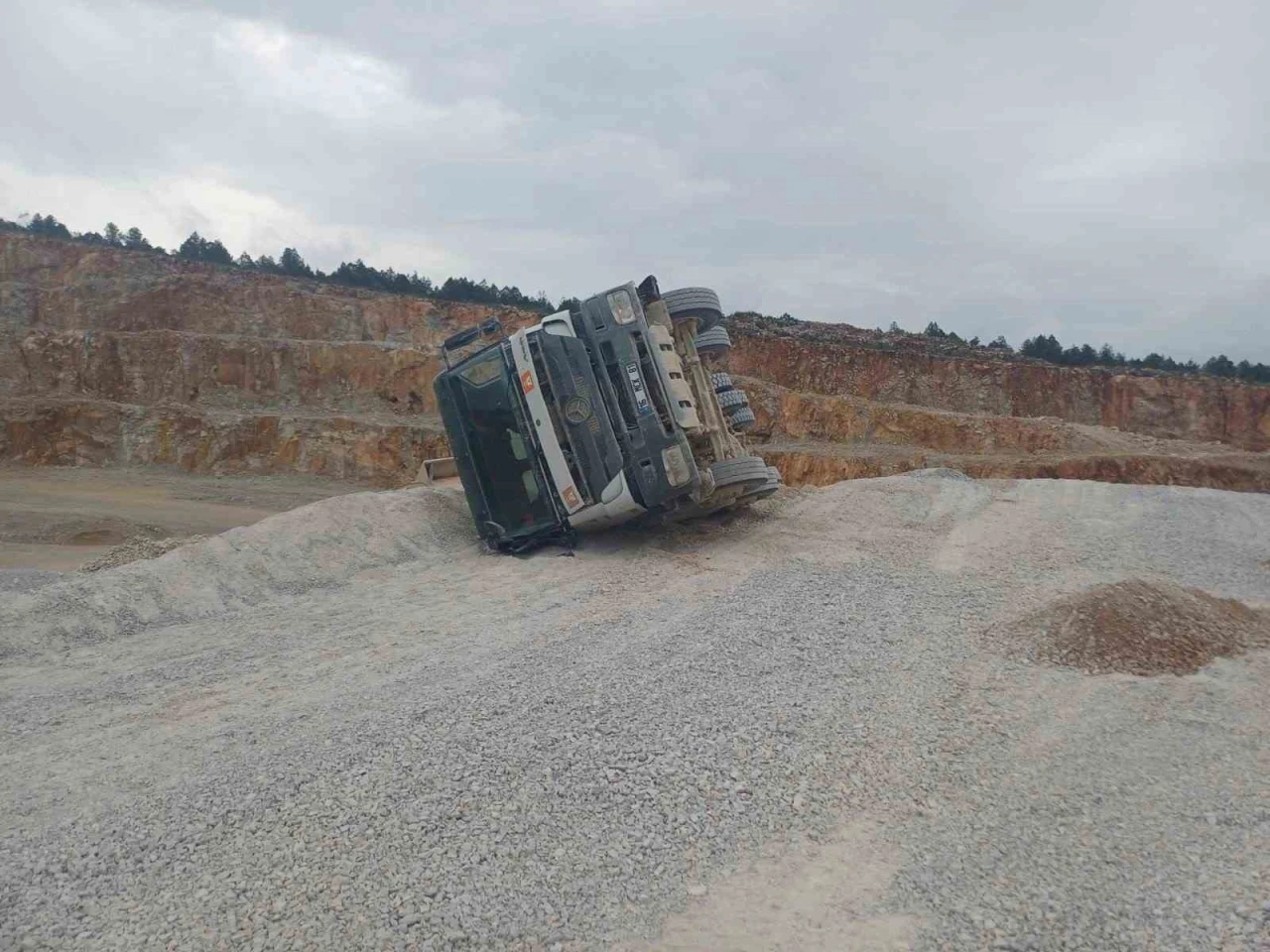Bilecik’in Necmiye Köyü bölgesinde bulunan inşaat şantiyesinde geri manevra yapan kum yüklü kamyon yan yatarak devrildi.