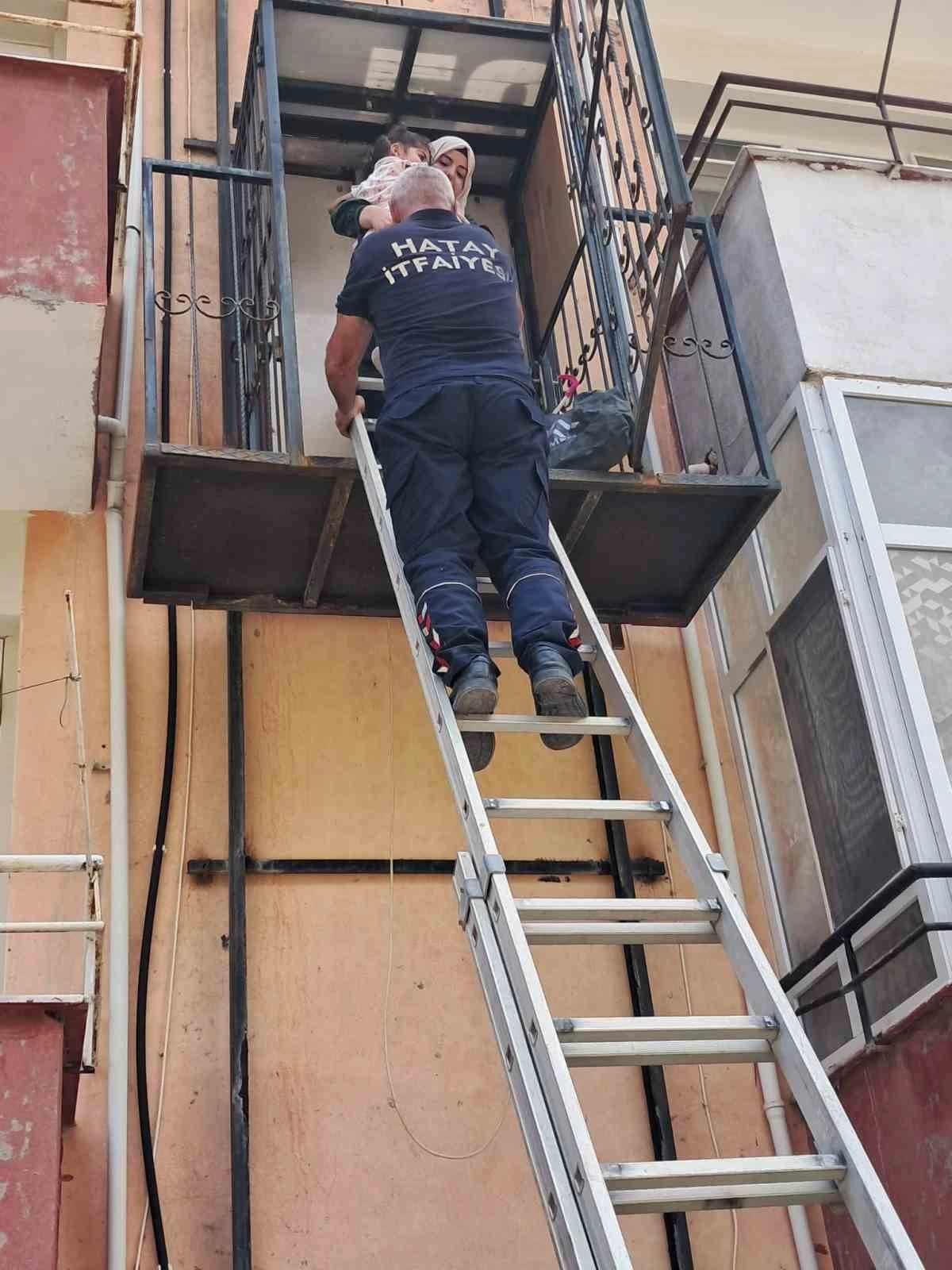 Hatay’ın Samandağ ilçesinde bir binanın dış cephesindeki asansörde mahsur kalan anne ve kız çocuğunu itfaiye ekipleri kurtardı.