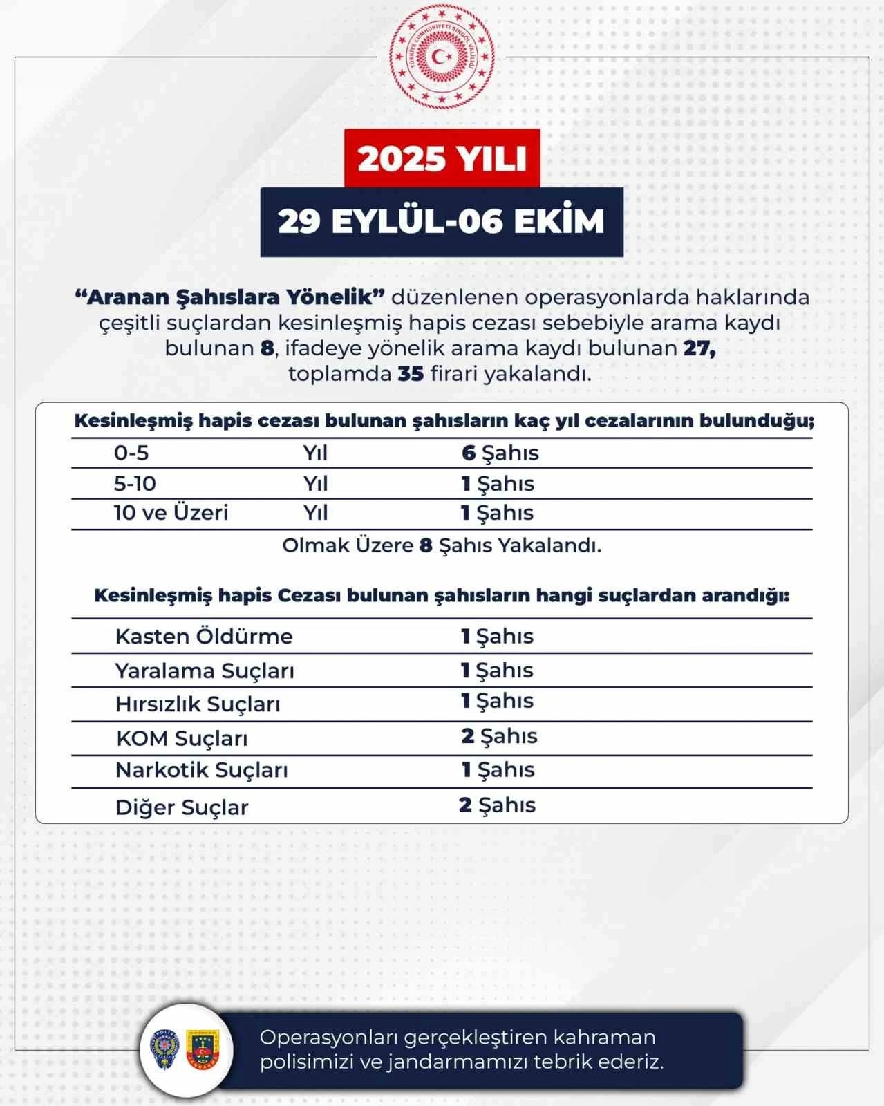 Öte yandan aranan şahıslara yönelik düzenlenen operasyonlarda, çeşitli suçlardan haklarında kesinleşmiş hapis cezası bulunan 8, ifadeye yönelik arama kaydı bulunan 27 kişi olmak üzere toplam 35 firarinin yakalandığı aktarıldı.