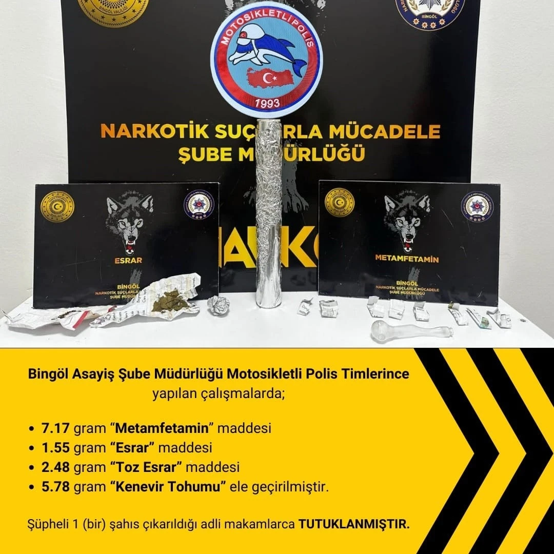 Bingöl’de polis ekipleri tarafından yapılan çalışmada, farklı tür ve miktarlarda uyuşturucu madde ele geçirildi. Bingöl’de İl Emniyet Müdürlüğü ekipleri kent genelinde çalışmalarını aralıksız sürdürüyor. Bu çerçevede yapılan çalışmalarda 7.17 gram Metamfetamin, 1.55 gram esrar, 2.48 gram toz esrar, 5.78 gram kenevir tohumu ele geçirilirken 1 şüpheli tutuklandı. Aynı zamanda Karlıova ilçesinde yapılan çalışmalarda ise 4.5 gram kubar esrar maddesi ele geçirilirken 1 şüpheli hakkında adli işlem başlatıldı.
