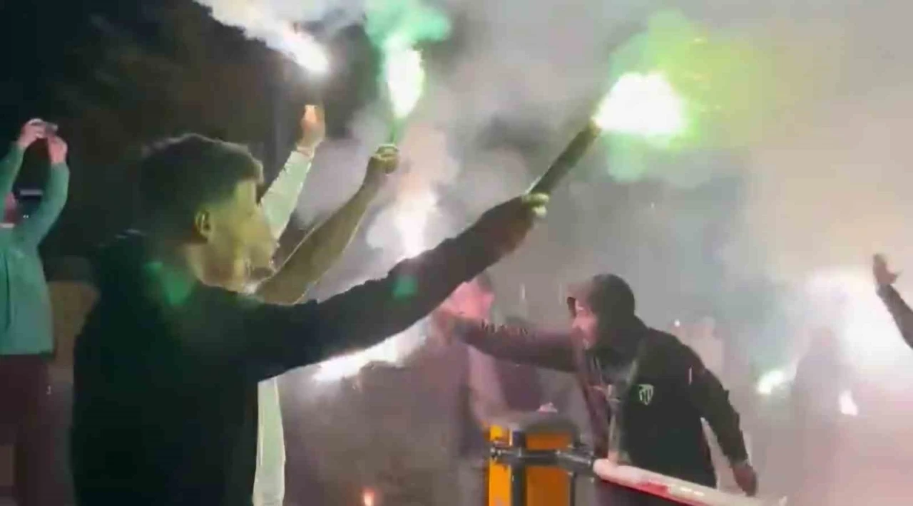 Trendyol 1. Lig’de Boluspor’un Fatih Karagümrük’ü mağlup etmesiyle matematiksel olarak Süper Lig’e çıkmayı garantileyen Kocaelispor’un bir grup taraftarı kutlamayı, maç için İstanbul’da olan takımın oteline giderek yaptı