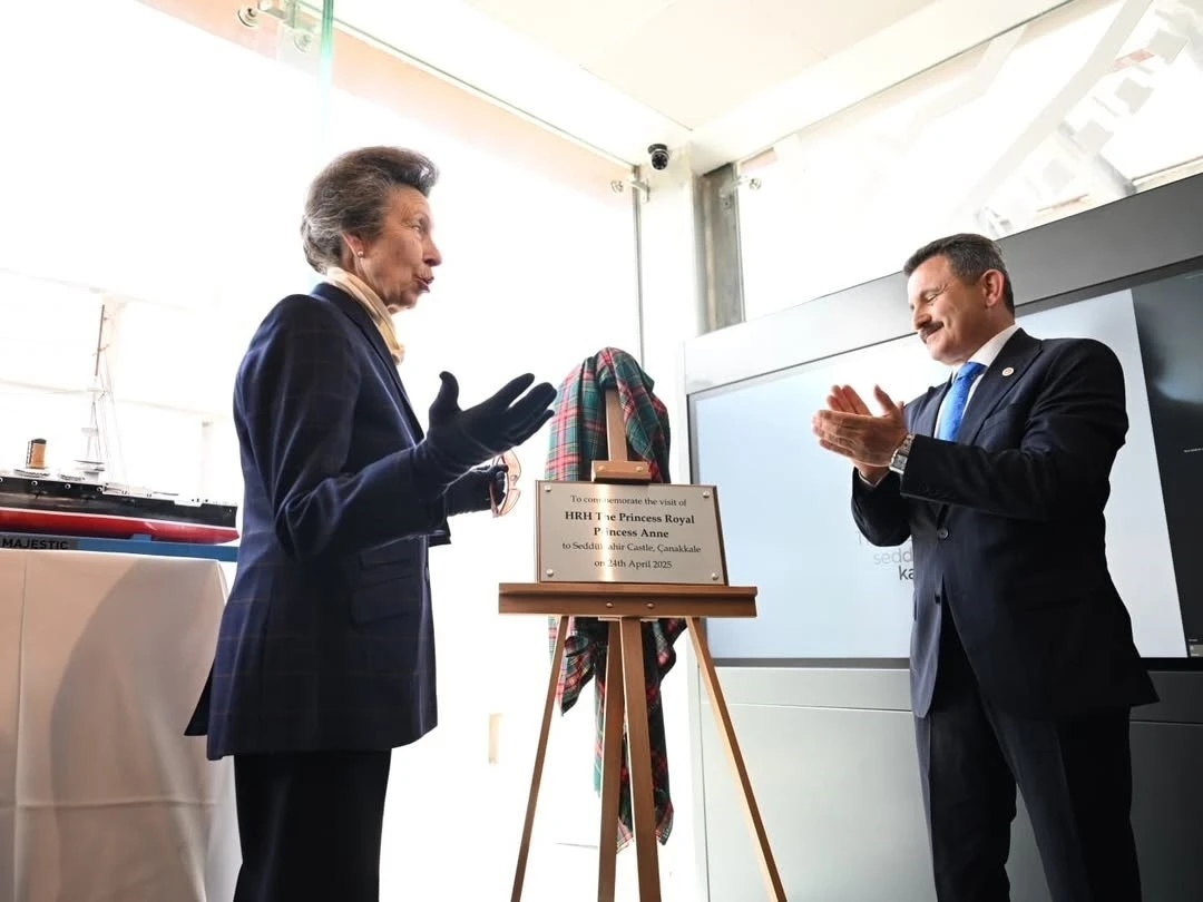 Prenses Anne’ye Seddülbahir Kalesi ziyaretinde Kültür ve Turizm Bakan Yardımcısı Gökhan Yazgı, Çanakkale Valisi Ömer Toraman, Çanakkale Savaşları Gelibolu Tarihi Alan Başkanı İsmail Kaşdemir ve yabancı konuklar eşlik etti.