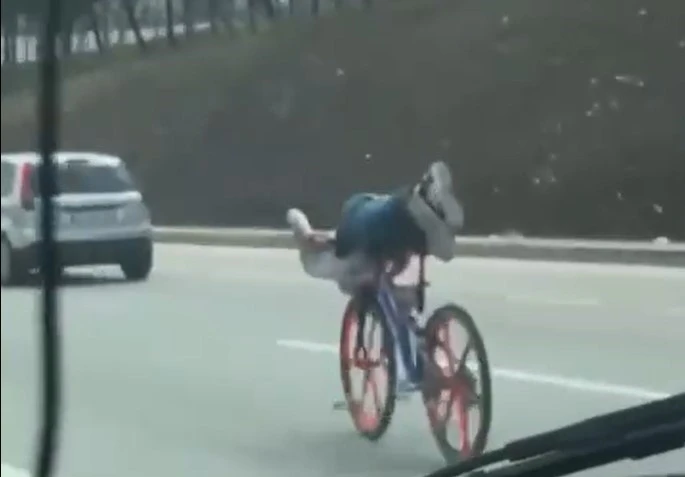 Görüntülerde, gençlerin araçların arasında zikzaklar çizerek ilerlediği, bisikletin üzerinde uzanarak gittiği, trafiği tehlikeye soktukları anlar yer aldı. Özellikle yoğun trafiğin olduğu yolda yaptıkları hareketlerle kazaya davetiye çıkaran gençler, çevredeki sürücüler tarafından da tepkiyle karşılandı.