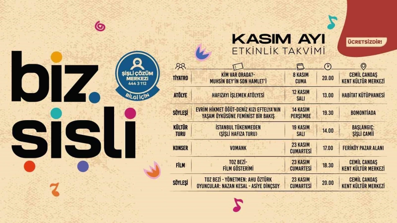 Şişli Belediyesi’nin ilçedeki kültürel çeşitliliğin birleştirici gücünü vurgulamak amacıyla hayata geçirdiği “Biz Şişli” etkinlik dizisi, kasım ayında da birbirinden özel etkinliklerle devam ediyor. Etkinlikler çerçevesinde ücretsiz şekilde gerçekleşecek tiyatro, film, konser, atölye, kültür turu ve söyleşilerle Şişlililer, kasım ayında kültür sanata doyacak. Kasım ayı etkinlikleri yarın, “Kim Var Orada? Muhsin Bey’in Son Hamlet’i” tiyatro oyunuyla başlayacak.