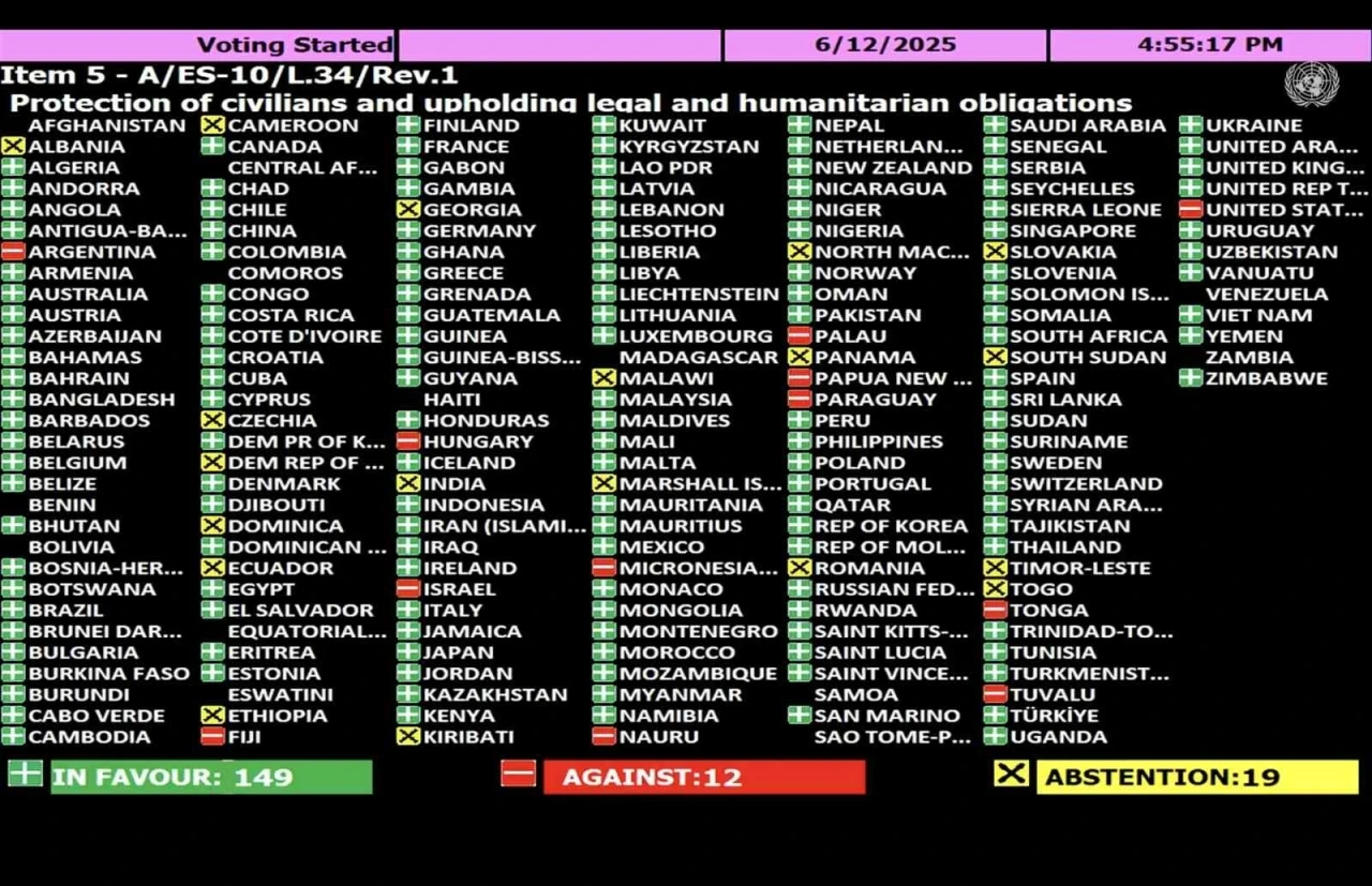 Gazze’de ateşkes talep eden, açlığın bir silah olarak kullanılmasını şiddetle kınayan ve İsrail’e insani yardımlara yönelik ablukayı kaldırma çağrısı yapan karar tasarısı, BM Genel Kurulu’nda 149 lehte, 12 aleyhte ve 19 çekimser oyla kabul edildi.