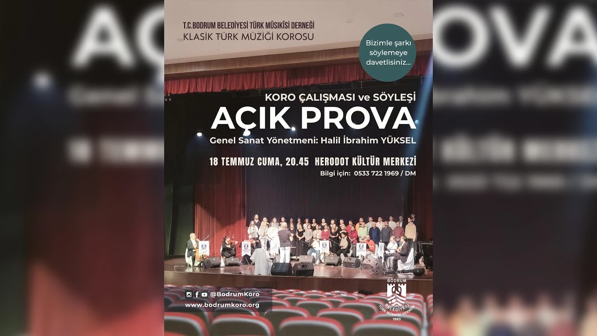 Bodrum Belediyesi Türk Musikisi Derneği Klasik Türk Müziği Korosu, 18 Temmuz Cuma günü Herodot Kültür Merkezi'nde halka açık ve ücretsiz bir koro çalışması ile söyleşi düzenliyor.