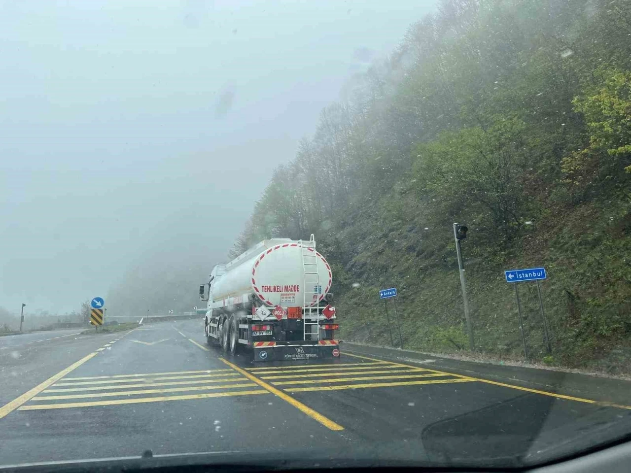 DÜZCE(İHA) – Bolu Dağı’nda hava sıcaklığının düşmesiyle hafif kar yağışı ve sis etkili oluyor.