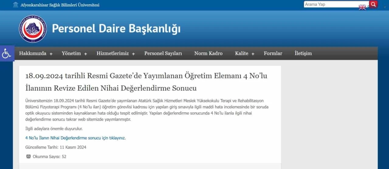 Afyonkarahisar Sağlık Bilimleri Üniversitesi (AFSÜ) Fizyoterapi ve Rehabilitasyon Bölüm Başkanının eşinin bölüme açılan ilan ile daha yüksek puanlı adaylar olmasına ve başvuruda 7.’nci sırada olmasına rağmen yazılı sınavdan verilen 100 puanla öğretim elemanı olarak işe başlatıldığı belirtildi.
