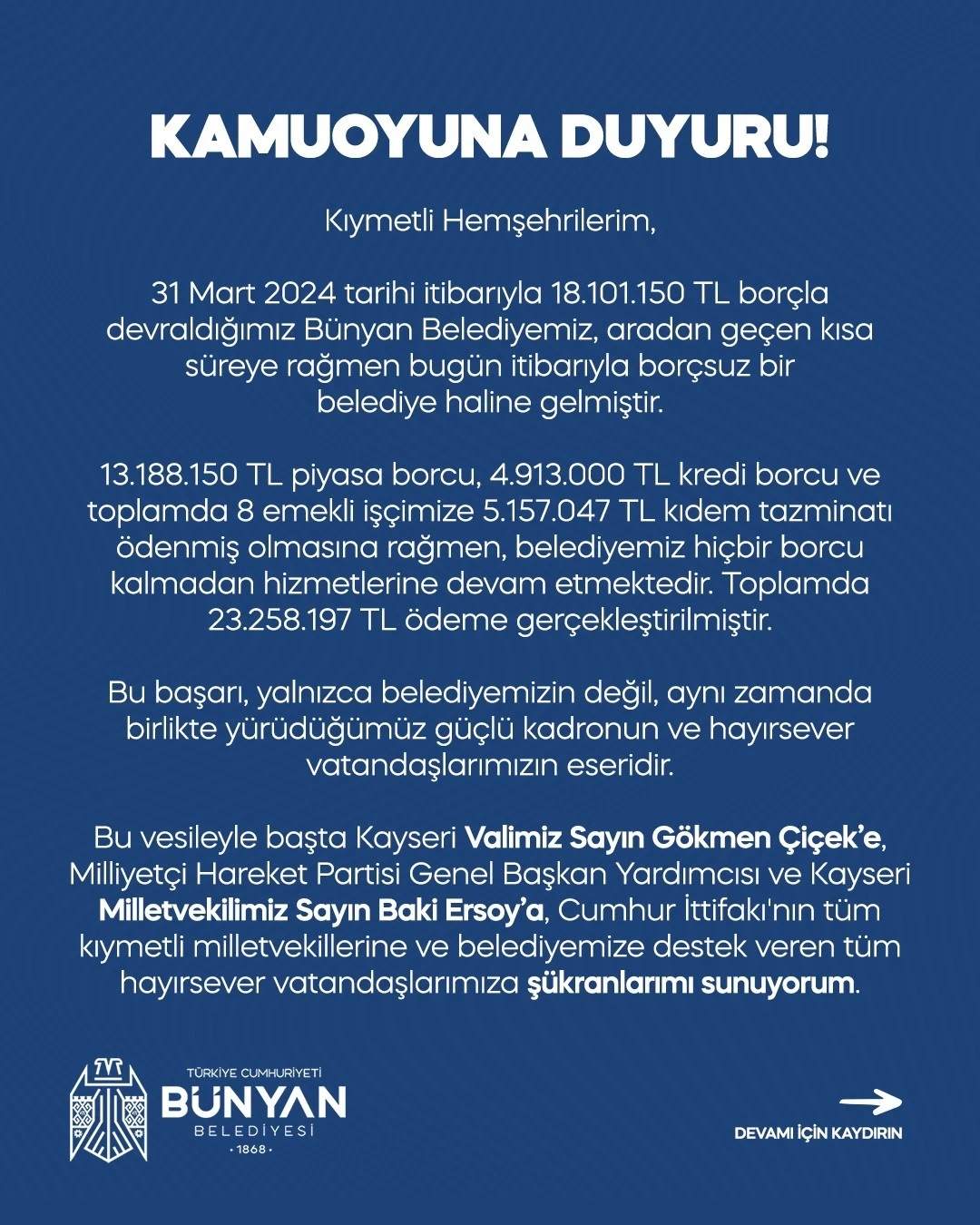 "Söz verdiğimiz gibi Bünyan’da israfı sona erdirdik, şeffaflığı esas aldık ve kaynaklarımızı halkımız için kullandık. Artık hedefimiz; borçsuz, güçlü ve hizmet odaklı bir belediyecilik anlayışıyla Bünyan’ımızı daha da ileri taşımaktır."