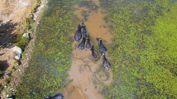 Ankara’nın Karadeniz bölgesindeki ilçesi Kızılcahamam’ın yaylalar besicilerin de gözdesi. Bu yaylalarda yetiştirilen mandalar sıcak nedeniyle kendileri göletlere atıyor. Göletlerle serinleyen mandaların görüntüsü Afrika’da çekilen belgesel görüntülerini aratmıyor. Mandaların yanı sıra yılkı atları da uçsuz bucaksız yaylaların müdavimleri. Mandaların ve yılkı atlarının muhteşem görüntüleri dron ile görüntülendi.