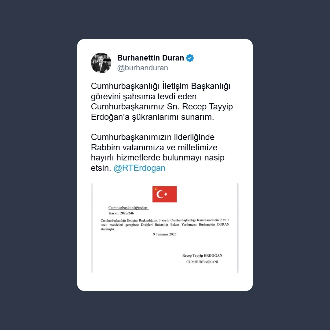 Cumhurbaşkanlığı İletişim Başkanlığı görevine Dışişleri Bakan Yardımcısı Burhanettin Duran getirildi. 9 Temmuz 2025 tarihli ve 2025/246 sayılı Cumhurbaşkanlığı Kararı ile Dışişleri Bakan Yardımcısı Burhanettin Duran, 3 sayılı Cumhurbaşkanlığı Kararnamesi’nin 2 ve 3’üncü maddeleri uyarınca Cumhurbaşkanlığı İletişim Başkanı olarak görevlendirildi.