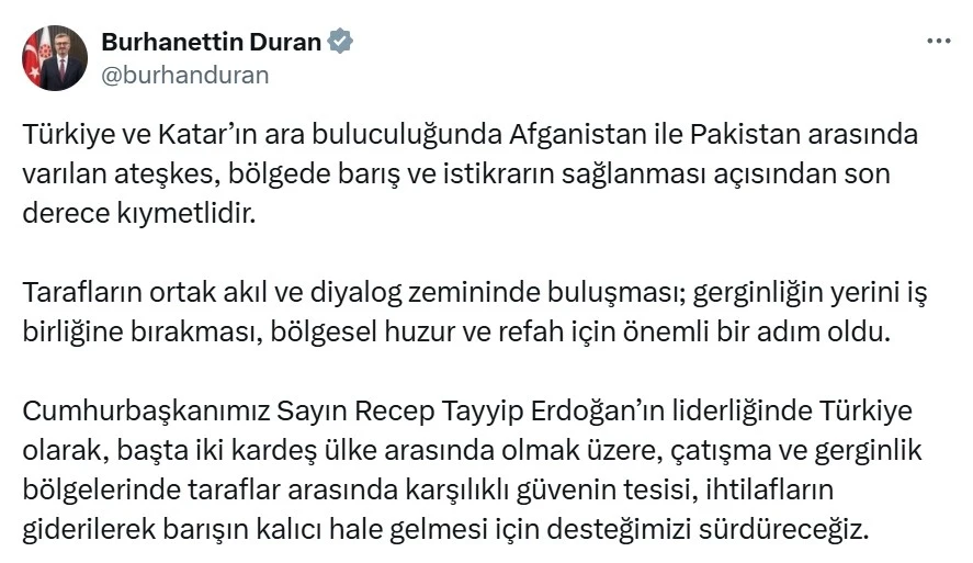 Cumhurbaşkanlığı İletişim Başkanı Burhanettin Duran, Türkiye ve Katar’ın arabuluculuğunda Afganistan ile Pakistan arasında varılan ateşkesin, bölge barışı açısından son derece kıymetli olduğunu vurguladı.