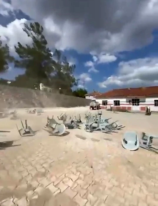 Bursa’nın Yenişehir ilçesinde çıkan hortum korku dolu anlar yaşattı. Etkinlik için meydana koyulan sandalyeler havada uçuşurken, o anlar kameraya yansıdı.