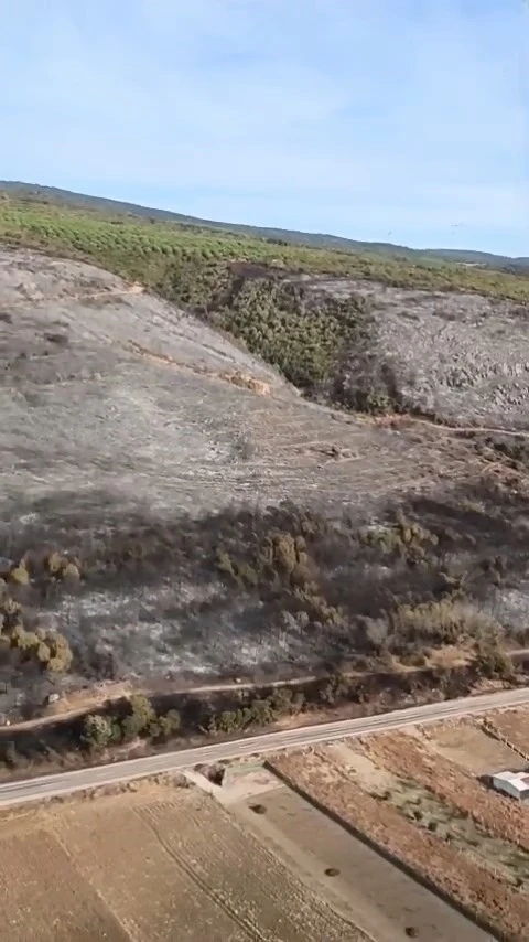 Bursa’nın Karacabey ilçesinde 16 saatlik hummalı çalışmanın sonucunda söndürülen ormanlık alandaki yangından geriye kalan küle dönmüş alan görüntülendi.