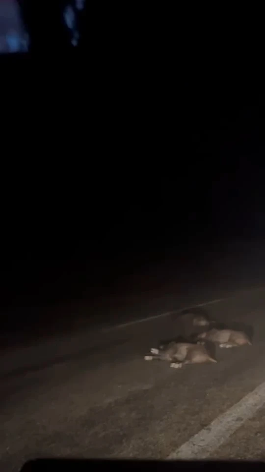 Bursa’da Orhaneli Yolu üzerinde gece saatlerinde seyreden bir araç, yola aniden atlayan domuz sürüsüne çarptı. Kaza sonucu 3 yavru yabani domuz telef oldu. Telef olan domuzları başka bir araç sürücüsü görüntüledi.