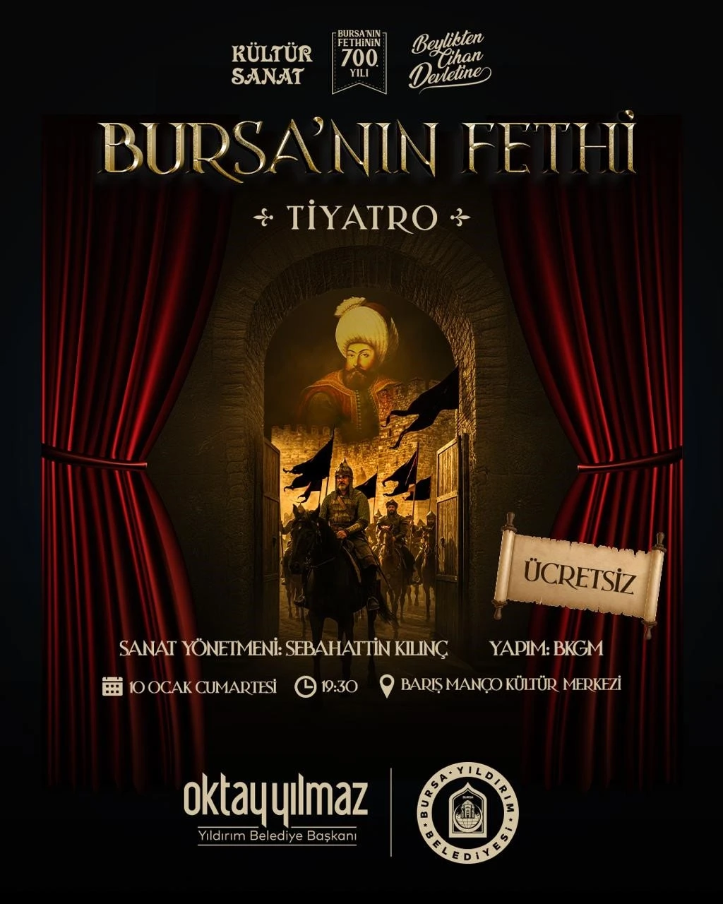 Yıldırım Belediyesi Kültür ve Sosyal İşler Müdürlüğü tarafından düzenlenen bir diğer etkinlik ise ‘Bursa’nın Fethi’ tiyatro oyunu olacak. Oyun, fetihte önemli bir rol oynayan Balaban Bey’in şahitlik ve anlatımlarıyla, Bursa’nın fethi sürecinde yaşananları sahneye taşıyacak. Sanat yönetmenliği Sebahattin Kılıç’ın yaptığı ve BKGM oyuncularının rol aldığı oyun, Barış Manço Kültür Merkezi’nde, 10 Ocak Cumartesi günü saat 19.30’da sahnelenecek.
