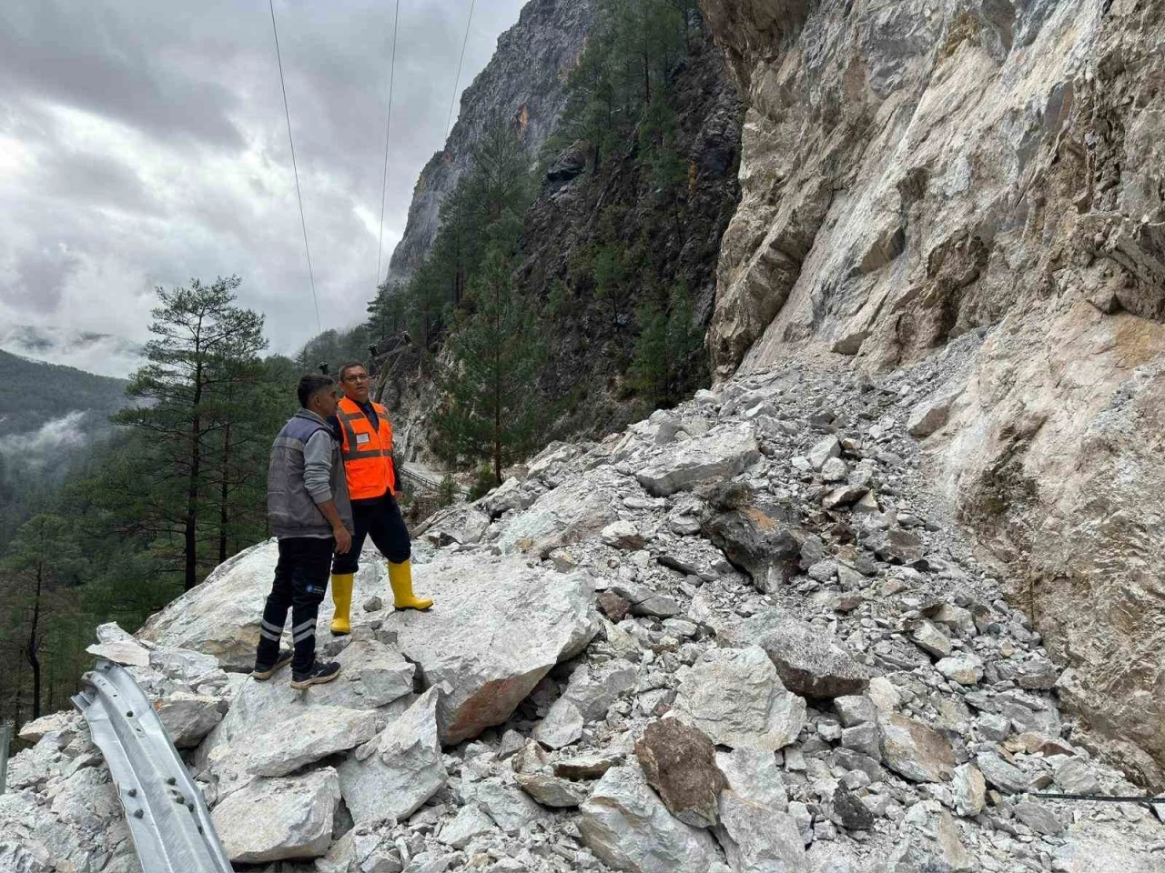 Sağanak yağış sonrası Alanya Dim Vadisi’nin en son mahallesi olan Alacami grup yolunda heyelan meydana geldi. Oldukça sarp bir vadiden geçen yola tonlarca ağırlığında kaya ve taş düştü. Mahallenin ilçeyle olan bağlantısı kesildi. Haberin alınması üzerine Antalya Büyükşehir Belediyesi Alanya Hizmet Birimi Şube Müdürü Gazi Öten, Yol Yapım, Bakım ve Onarım Dairesi Alanya ekibiyle birlikte bölgeye gitti. Mahalle muhtarı ve sakinleriyle heyelan bölgesinde inceleme yapıldı. Kısa sürede de Büyükşehir Belediyesinin iş makineleri bölgeye intikal ettirildi. İş makinesiyle yapılan çalışmalar sonrası yol ulaşıma açıldı. Büyükşehir ekiplerinin heyelan nedeniyle kapanan Yaylakonak Mahallesi grup yolunda yolu açma çalışmaları sürüyor.