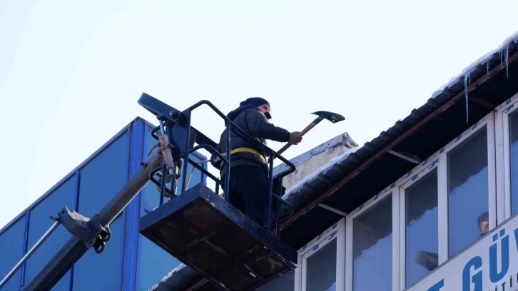 Erzurum’da kar yağışının ardından çatılarda oluşan kar kütleleri ve buz sarkıtları Büyükşehir Belediyesi itfaiye ekipleri tarafından kırılıyor.