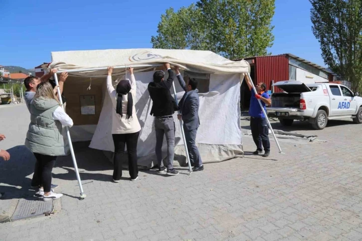 DENİZLİ (İHA) – Denizli’nin Çameli ilçesinde, belediye personelleri ve mahalle muhtarlarına ilkyardım ve afetlere hazırlık eğitimi verildi. Çameli Belediyesi personellerine, Denizli Afet ve Acil Durum (AFAD) İl Müdürlüğü uzman personelleri tarafından belediyenin şantiye alanında “Afet Anında Çadır Kurma” eğitimi verildi. Eğitime katılım gösteren belediye personelleri, AFAD görevlisiyle beraber afet çadırı kurdu. Verilen eğitimde, çadır kurarken dikkat edilecek hususlar hakkında de bilgi verildi. Belediye personellerine verilen afet anında çadır kurma eğitiminin ardından belediye konferans salonunda, mahalle muhtarlarına yönelik "İlkyardım ve Afet Hazırlığı" eğitimi gerçekleştirildi. Uzman personeller tarafından verilen eğitimde, ülkemiz genelindeki afet bölgeleri tanıtıldı ve afete karşı alınacak tedbirler hakkında görüş alışverişinde bulunuldu.