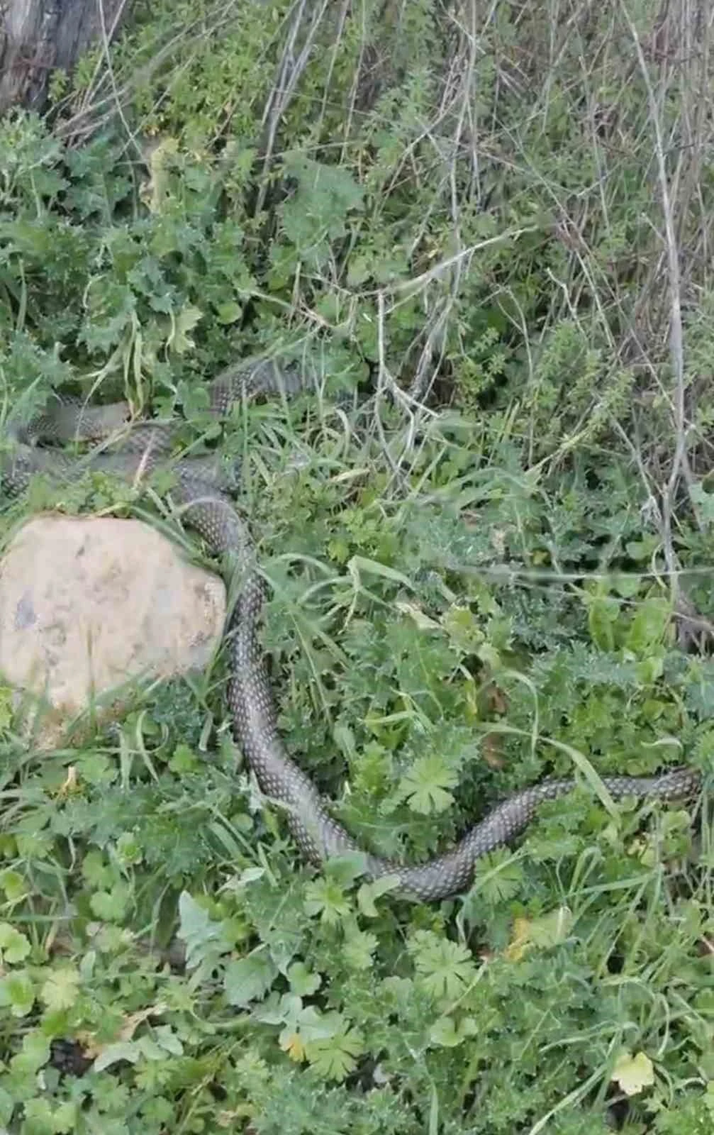 Çan ilçesine bağlı Hurmaköy’de yaşayan bir vatandaş, akşam saatlerinde çıktığı yürüyüşte yol kenarında bir yılan olduğunu fark etti. Yılanın yaklaşık 2 metre uzunluğunda olduğunu gören vatandaş, yılanı cep telefonu kamerasıyla kaydetti. Yılan bir süre sonra otların arasında ilerleyerek gözden kayboldu.