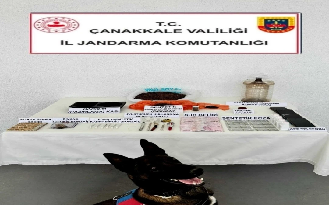 Çanakkale İl Jandarma Komutanlığı ekiplerince uyuşturucu ve uyarıcı madde ile mücadele çerçevesinde Çanakkale Cumhuriyet Başsavcılığı koordinesinde 5 Ekim tarihinde Çanakkale merkezde operasyon düzenlendi. Operasyon çerçevesinde uyuşturucu madde ticareti yaptıkları ve kullandıkları tespit edilen 5 şüpheliye ait 7 adreste ve 2 araçta narkotik köpeğinin de katılımıyla 35 personel ile operasyon gerçekleştirildi. Yapılan aramada; 450 gram sentetik kannabinoid, 120 adet sentetik ecza, 6 adet satışa hazır fişeklenmiş sentetik kannabinoid, 6 adet uyuşturucu kullanma aparatı payp, uyuşturucu kullanma aparatı kova, öğütme aparatı, 9 adet cep telefonu, suçtan elde edilen 6 bin 200 TL ele geçirildi. Uyuşturucu veya uyarıcı madde imal ve ticareti ve uyuşturucu veya uyarıcı madde kullanmak suçlarından 9 şüpheli yakalandı. Emniyetteki işlemlerinin ardından adliyeye sevk edilen 9 şüpheliden 3’ü tutuklanarak Çanakkale Kapalı Ceza İnfaz Kurumuna gönderildi.