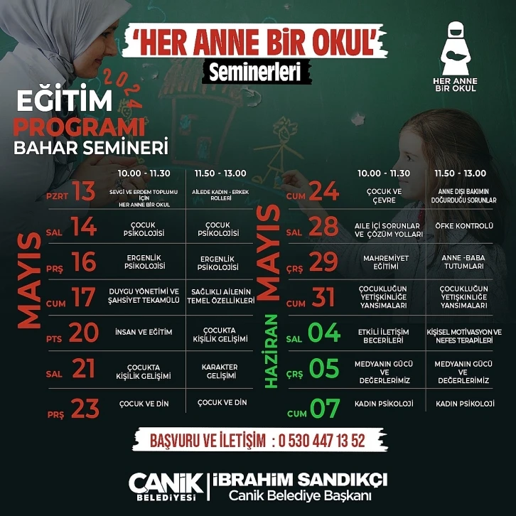 Canik Belediyesi’nin anneleri aile yaşamı, ergen ve çocuk psikolojisi başta olmak üzere birçok konu başlığında alanında uzman eğitmenlerle buluşturduğu ‘Her Anne Bir Okul’ seminer programı başvuruları sürüyor. Mayıs ve haziran ayları boyunca devam edecek olan seminerler çerçevesinde, kişisel gelişim ve etkili iletişim alanlarında da annelere eğitim verilecek. Son başvuru 12 Mayıs