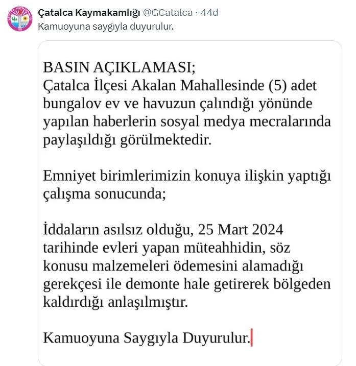 Çatalca’da alacak verecek meselesi yüzünden 5 adet bungalov alan vatandaşların evleri, havuzlarıyla birlikte çalındığı iddia edilmişti. Çatalca Kaymakamlığından yapılan açıklamada, "Çatalca ilçesi Akalan Mahallesi’nde 5 adet bungalov ev ve havuzun çalındığı yönünde yapılan haberlerin sosyal medya mecralarında paylaşıldığı görülmektedir. Emniyet birimlerimizin konuya ilişkin yaptığı çalışma sonucunda; iddiaların asılsız olduğu, 25 Mart 2024 tarihinde evleri yapan müteahhidin, söz konusu malzemeleri ödemesini alamadığı gerekçesi ile demonte hale getirerek bölgeden kaldırdığı anlaşılmıştır” denildi.