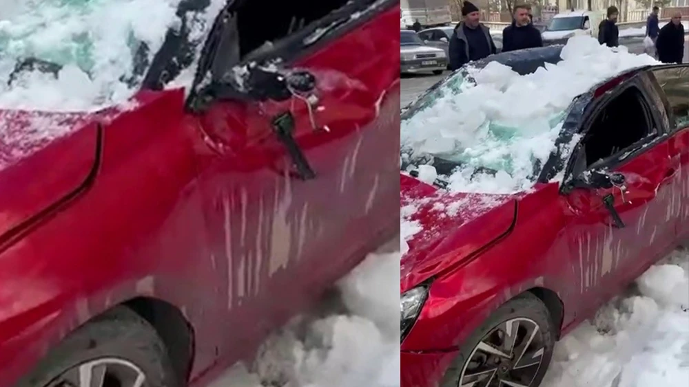Erzurum’un Palandöken ilçesi Kayak Yolu semtinde, bir binanın çatısında biriken dev kar kütlesi, park halindeki bir otomobilin üzerine düştü. Büyük bir gürültüyle düşen kar kütlesi, aracın tavanını çökertti ve camlarını kırarak kullanılamaz hale gelmesine yol açtı.