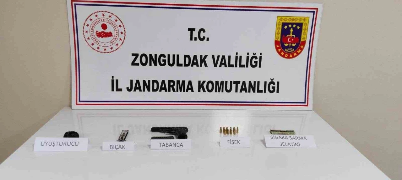 Çaycuma ilçesinde, jandarma ekiplerince gerçekleştirilen denetim sırasında E.O. (28), M.H. (23) ve B.A. (20) isimli şahısların bulunduğu araçta yapılan aramada; 5 gram kubar esrar, 1 adet 7.65 mm ruhsatsız tabanca,