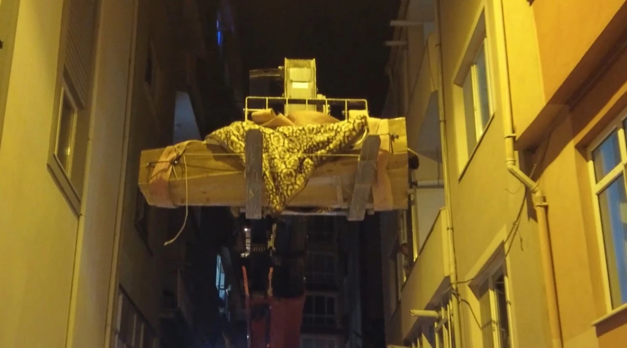 Edirne’de günler sonra evinde cansız bedeni bulunan ve yaklaşık 165 kiloya ulaşan kişinin cesedi evden vinçle çıkarıldı.