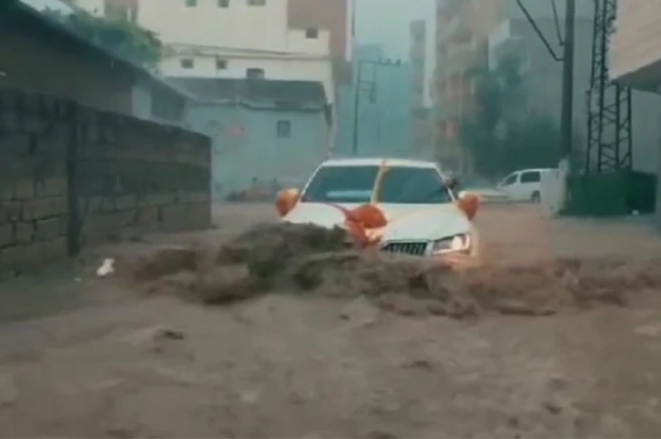 Şırnak’ın Cizre ilçesinde dün etkili olan sağanak, kentte hasara yol açtı. Sel sırasında bir gelin arabası suların ortasında kalırken, su seviyesinin yükselmesiyle sürücü aracıyla ilerleyip kurtulmaya çalıştı.