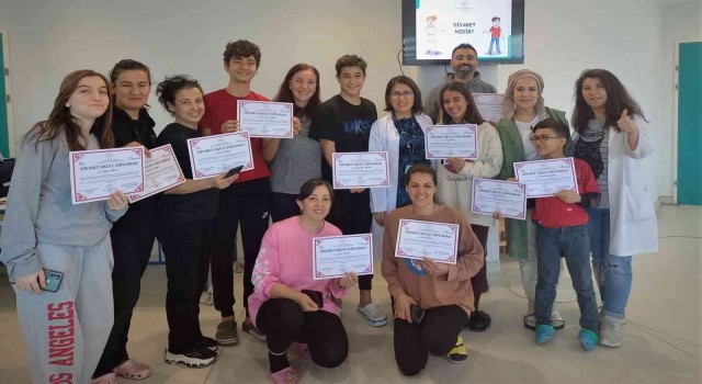 Muğla Eğitim ve Araştırma Hastanesi’nde çocuklarda diyabeti, beslenme, egzersiz ve ilaç tedavisi ile kontrol altına alabilmek için Sağlık Bakanlığı tarafından yürütülen ve “Türkiye Diyabet Önleme ve Kontrol Programı” çerçevesinde başlatılan eğitimin ilki verildi. Diyabetli çocuk hasta ve ailelerinin katıldığı eğitimde diyabet hastalığının nedenleri, hangi bulgularda bir sağlık kuruluşuna veya hekime başvurmak gerektiği, rutin kontrollerinin önemi, insülin kullananlarda insülin uygulama yöntemleri, beslenmede dikkat edilmesi gereken durumlar, egzersiz ve fiziksel aktivitenin önemi gibi konular Endokrin Uzmanı Dr. Gülay Can Yılmaz, Diyabet Eğitim Hemşireleri Seval Gökçe, Fadime Çakmak, Diyetisyen Cansu Duman ve sosyal çalışmacı Sercan Karaoğlan’ın da diyabetli bireylerin sosyal hakları sunumlarının gerçekleştirdiği eğitimin sonunda Tip1 diyabetli çocuklara ve ailelerine diyabet okulu diplomaları verildi.