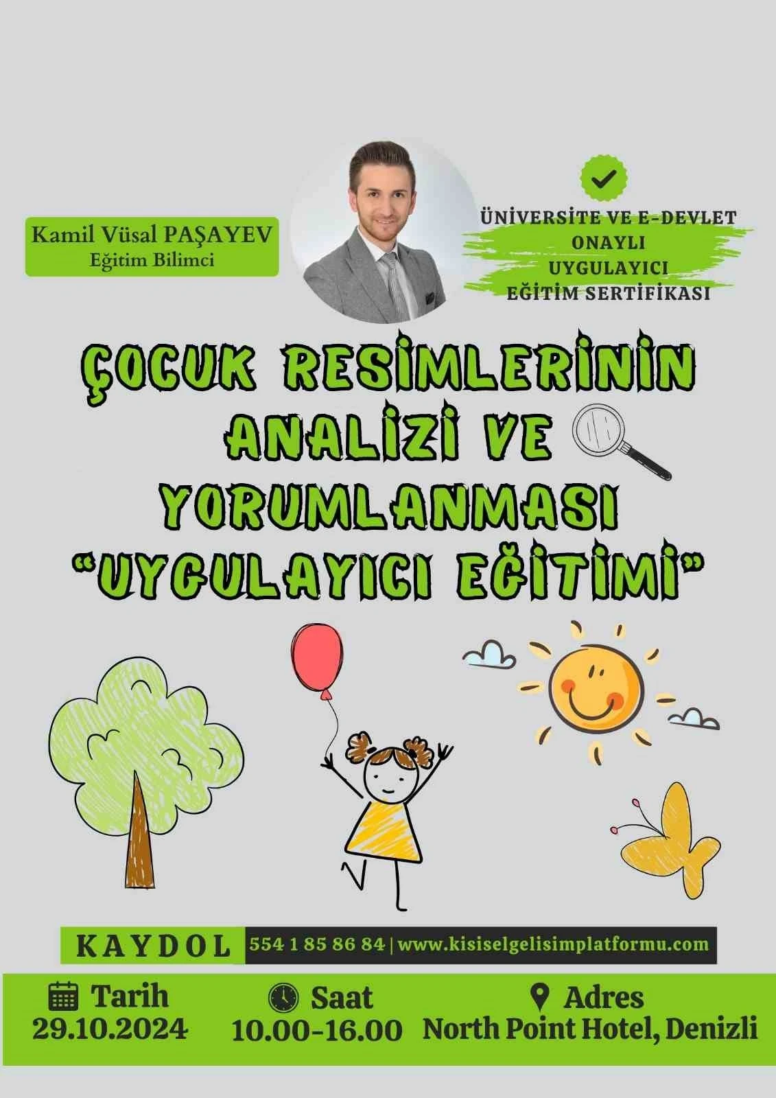 devlet ve üniversite onaylı sertifika takdim edilecek. Ebeveyn-çocuk ilişkisi üzerine pedagojik ve akademik çalışmalar yapan Eğitim Bilimci Kamil Vüsal Paşayev tarafından “Çocuk Resimleri Analizi ve Yorumlanması” uygulayıcı eğitimi verilecek. 29 Ekim 2024 Salı günü Denizli North Point Hotelde düzenlenecek eğitime, www.kisiselgelisimplatformu.com adresi üzerinden kayıt yaptırılabilecek. Çocuk Resimleri Analizi ve Yorumlanması Eğitimi hakkında bilgiler veren Eğitim Bilimci Kamil Vüsal Paşayev, “Bu eğitim programı, çocukların çizdiği resimleri psikolojik testler aracılığıyla yorumlayarak ruh sağlığı hakkında neticeye varmayı sağlayan bir eğitim modelidir. Bu eğitim programı, aşağıda belirtilen mental problemlerin kaynağını öğrenme ve bu problemlerle ilgili doğru teşhis koyabilmeyi amaçlamaktadır. Eğitimde çocukların içe kapanıklığı, hiperaktivite, dikkat dağınıklığı, iletişim kopukluğu, özgüven eksikliği, okul fobisi, yalan söyleme, tırnak yeme, alt ıslatma, okulda başarısızlık, cinsel istismar, sosyal fobi, obsesif-kopulsif vakalar, öğrenme problemeleri, zeka geriliği, üstün zekalılık, korku, şiddet ve öfkelenme durumları üzerinde değerlendirmelerde bulunacağız” dedi. Eğitim sonunda uluslararası geçerli, uygulayıcı e-devlet ve üniversite onaylı sertifika verileceğini açıklayan Paşayev, “Psikologlar, doktorlar, psikolojik danışmanlar, sosyologlar, okul öncesi öğretmenleri, ana sınıfı öğretmenleri, sınıf öğretmenleri, rehber öğretmenler, çocuk gelişimi ve eğitimi öğretmenleri, aile danışmanları, terapistler ve yukarıda yazılı bölümlerin 3. ve son sınıf öğrencileri bu eğitime katılabilirler. Eğitim sonunda uluslararası geçerli, uygulayıcı e-devlet ve üniversite onaylı sertifika verilecektir. Eğitime tüm anne babalar da katılabilir. Fakat bu durumda katılımcı ebeveynlerimize uygulayıcı sertifika değil, yalnız katılım sertifikası verilecektir. Verilen sertifika sayesinde özel eğitim merkezleri, anaokulları ve kreşler, koçluk ve psikolojik danışmanlık merkezleri, rehabilitasyon merkezleri ve hastaneler gibi kurumlarda çalışabilir, çocukların çizdiği resimler araçlığı ile ruhsal dünyalarını çözümleyerek çocuğa ve aileye fayda sağlayabilirsiniz” diye konuştu.