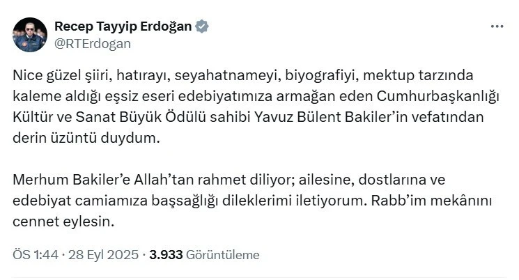 Cumhurbaşkanı Recep Tayyip Erdoğan sosyal medya hesabından yaptığı paylaşımda, Cumhurbaşkanlığı Kültür ve Sanat Büyük Ödülü sahibi Yavuz Bülent Bakiler’in vefatına ilişkin başsağlığı mesajı yayımladı. Cumhurbaşkanı Erdoğan paylaşımında şu ifadelere yer verdi: