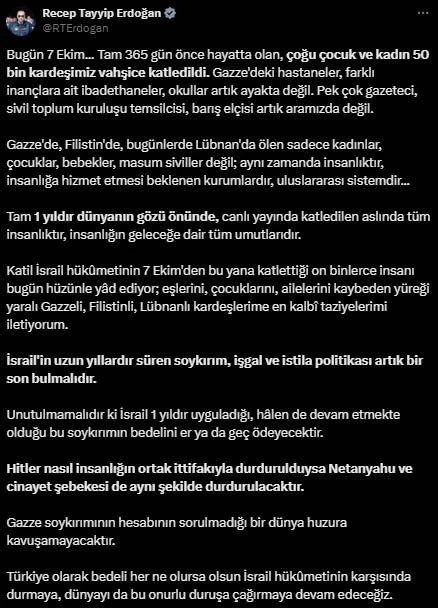 Cumhurbaşkanı Erdoğan, "Katil İsrail hükûmetinin 7 Ekim’den bu yana katlettiği on binlerce insanı bugün hüzünle yâd ediyor; eşlerini, çocuklarını, ailelerini kaybeden yüreği yaralı Gazzeli, Filistinli, Lübnanlı kardeşlerime en kalbî taziyelerimi iletiyorum. İsrail’in uzun yıllardır süren soykırım, işgal ve istila politikası artık bir son bulmalıdır. Unutulmamalıdır ki İsrail 1 yıldır uyguladığı, hâlen de devam etmekte olduğu bu soykırımın bedelini er ya da geç ödeyecektir. Hitler nasıl insanlığın ortak ittifakıyla durdurulduysa Netanyahu ve cinayet şebekesi de aynı şekilde durdurulacaktır. Gazze soykırımının hesabının sorulmadığı bir dünya huzura kavuşamayacaktır. Türkiye olarak bedeli her ne olursa olsun İsrail hükûmetinin karşısında durmaya, dünyayı da bu onurlu duruşa çağırmaya devam edeceğiz" ifadelerini kullandı.