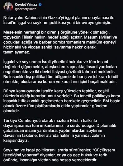 Cumhurbaşkanı Yardımcısı Cevdet Yılmaz sosyal medya hesabından yaptığı paylaşımda Netanyahu Kabinesi’nin Gazze’yi işgal planını onaylaması ile İsrail’in işgal ve soykırım politikasının yeni bir evreye girdiğini belirterek, şu ifadelere yer verdi: