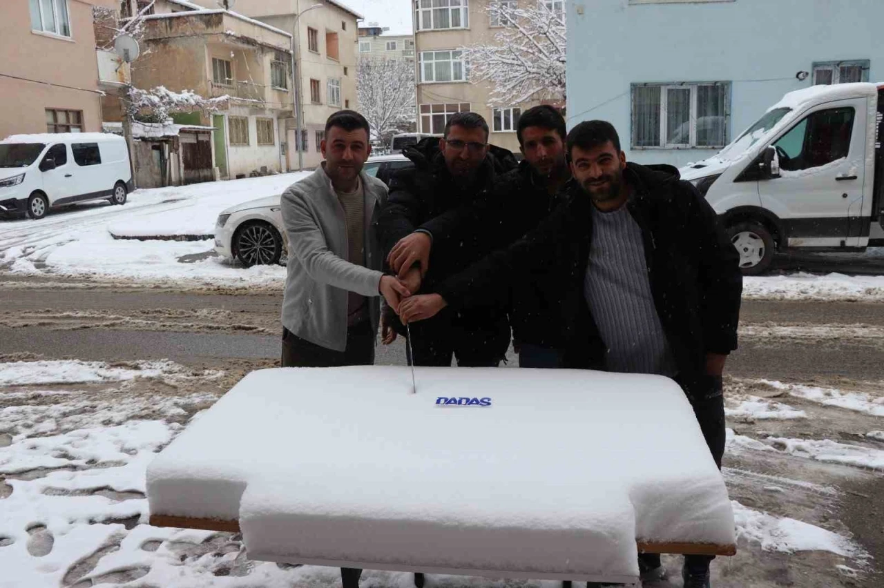 Erzurum’un taşı ile meşhur Oltu ilçesinde, bir işyerinin önünde dışarıda kalan masa, yoğun kar yağışı nedeniyle pasta görünümüne büründü. Oltulu esnaftan Fırat Aydın, komşu esnafla birlikte bu durumu eğlenceli bir hale dönüştürdü. Karla kaplanan masaya bakarak, "Dadaşın pastası kardan olur" diyerek, pastayı keser gibi karı kestiler.