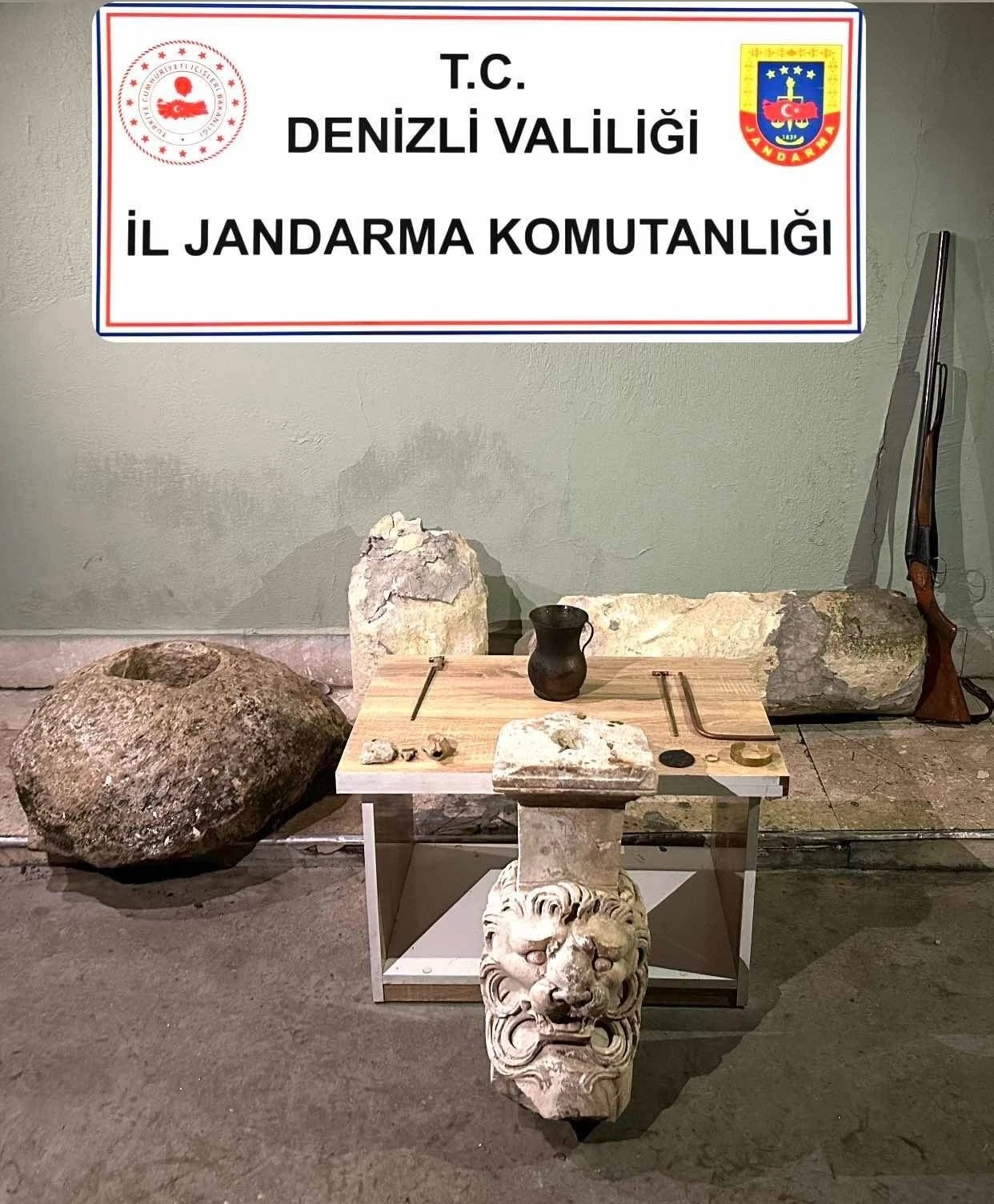 Denizli’nin Buldan ilçesinde tarihi eser kaçakçılığı yaptığı belirlenen şahsa yönelik operasyon düzenlendi. Operasyon kapsamında Bizans ve Roma dönemlerinden çok sayıda tarihi eser ele geçirildi. Denizli İl Jandarma Komutanlığına bağlı ekipler Buldan ilçesinde tarihi eser kaçakçılığı yapan şahsı takibe aldı. Jandarma ekipleri takibe aldığı şahsa yönelik kapsamlı operasyon düzenledi. Düzenlenen operasyon kapsamında, Bizans ve Roma dönemlerine ait 1 adet yüzük, 1 adet kandil, 1 adet bilezik, 1 adet vazo, 1 adet madalyon, 1 adet Arslan başlı heykel sütunu, 2 adet taş sütun, 3 adet demir arama çubuğu ve 1 adet av tüfeği ele geçirildi. Ele geçirilen malzemelere el konulurken, 1 şüpheli şahıs hakkında “2863 Sayılı Kültür ve Tabiat Varlıkları Koruma Kanununa Muhalefet” suçunu işlemekten adli işlem başlatıldığı öğrenildi.
