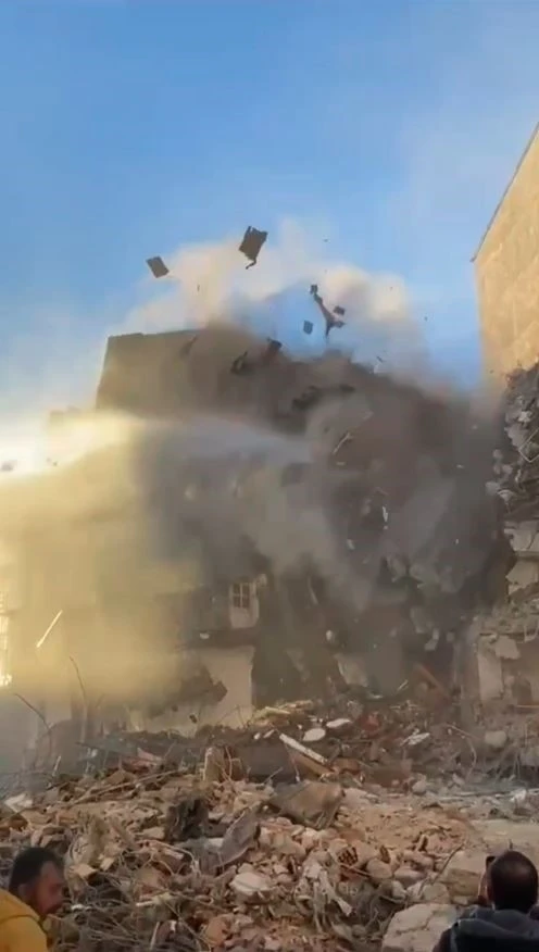 Kahramanmaraş merkezli depremlerde Elazığ’da ağır hasar alan bina, yoğun korna sesi ile birlikte iş makinesinin dokunmasıyla yerle bir oldu.