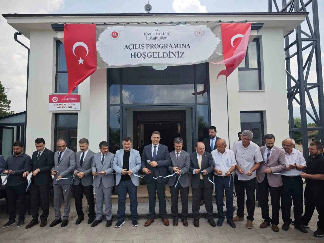 Düzce’de 2 yıl önce meydana gelen depremin ardından ağır hasar alarak yıkılan 22 camiden birisi olan Bataklıçiftlik köyü cami düzenlenen açılış programı ile hizmete açıldı. Düzce Valisi Selçuk Aslan ile Düzce Milletvekili Ercan Öztürk’ün de katıldığı açılış programında caminin yapılmasına destek veren hayırsever vatandaşlara teşekkür edildi. Açılışta konuşan Düzce Milletvekili Ercan Öztürk, "23 Kasım Düzce Depremi’nde aldığı ağır hasar sonucu yeniden inşa edilen Bataklıçiftlik Köyü Cami’nin açılışını gerçekleştirdik. Her harcında bir dua, her taşında bir umut olan bu mabedin inşasına destek veren tüm hayırseverlerimizin, Rabb’im niyetlerini kabul, emeklerini makbul eylesin. Bataklıçiftlikli kardeşlerimizin gönül dünyasına ışık olacak camimiz hayırlı olsun" ifadelerini kullandı.