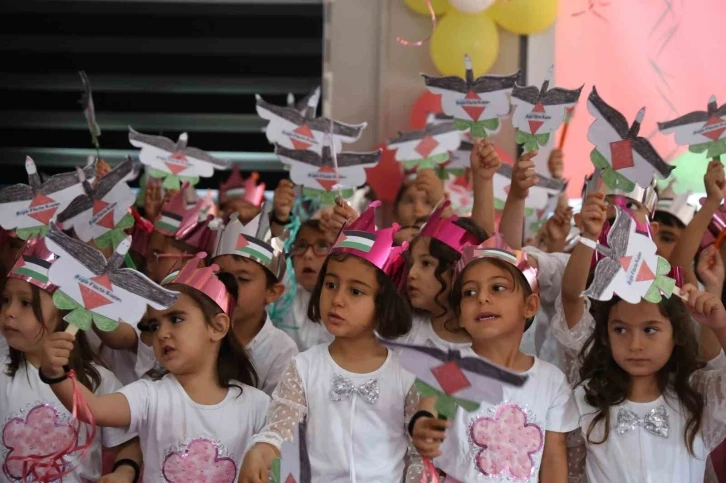 Konteyner kentte bir yıl boyunca eğitim gören minik çocuklar, yılsonu etkinliğinde kendi yaptıkları Filistin bayraklarıyla Filistinlilere destek oldu.