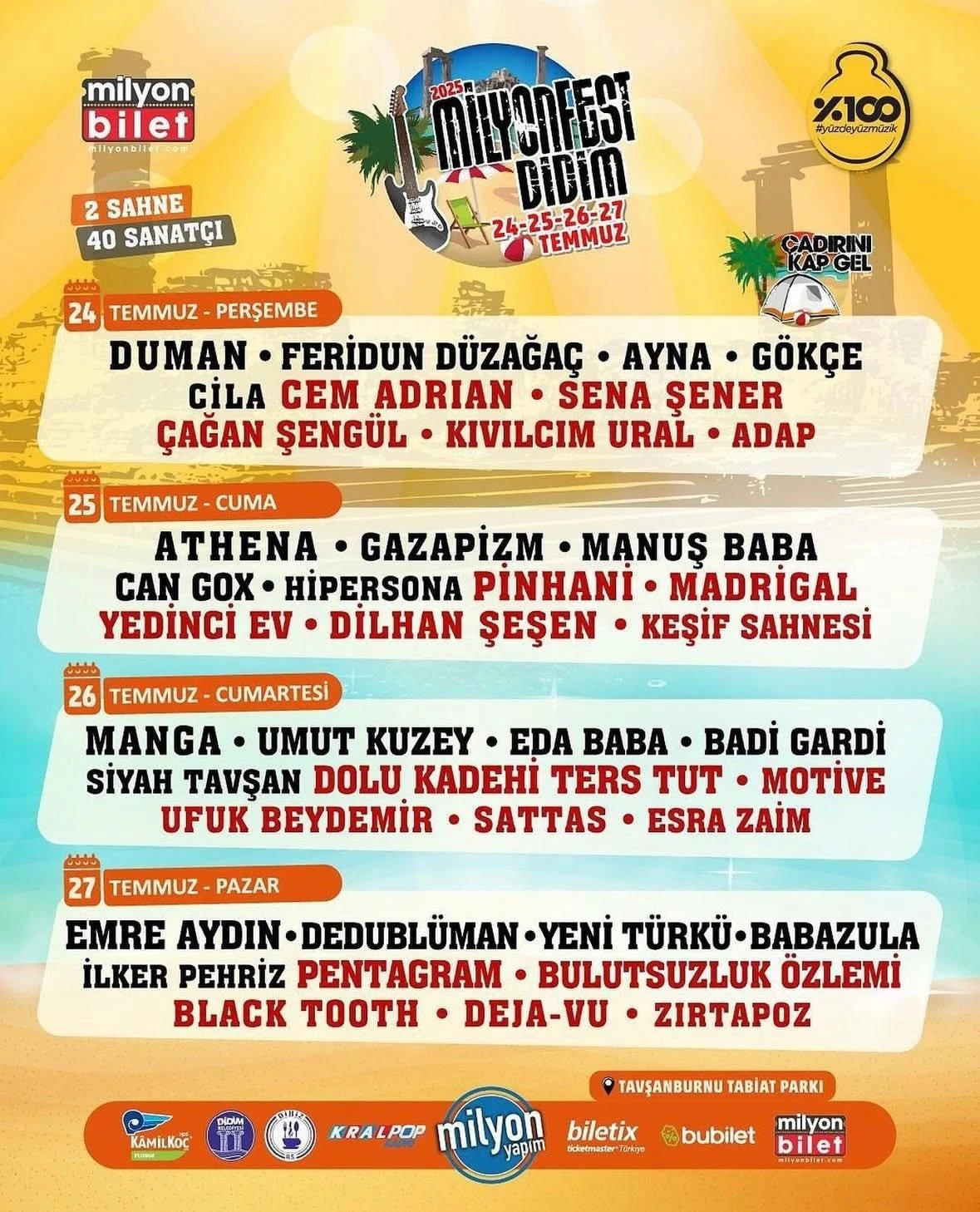 Ege Bölgesi’nin gözde turizm kentlerinden biri olan Didim, bu yaz Milyonfest Didim 2025 ile müziğin ve doğanın buluştuğu unutulmaz bir festivale ev sahipliği yapacak. Didim Belediyesi’nin destekleriyle düzenlenen festival, 24-27 Temmuz tarihleri arasında Tavşanburnu Tabiat Parkı’nda gerçekleşecek. Doğayla iç içe, deniz kıyısında konumlanan festival alanında dört gün boyunca kamp ve konser keyfi bir arada sunulacak. Türkiye’nin önde gelen sanatçılarının sahne alacağı festivalde rock, pop, alternatif ve rap müziğin en sevilen isimleri müzikseverlerle buluşacak. Festival programı kapsamında; 24-27 Temmuz tarihleri arasında birbirinden ünlü isimler sahne alacak. Didim Belediye Başkanı Hatice Gençay, festivale ilişkin yaptığı açıklamada, "Milyonfest Didim, ilçemizin doğal ve kültürel potansiyelini tanıtmak açısından çok kıymetli bir organizasyon. Yerli ve yabancı binlerce müzikseveri Didim’de ağırlayacak bu büyük buluşmanın, hem turizmimize hem de yerel ekonomimize önemli katkılar sağlayacağına inanıyoruz. Tüm sanatseverleri bu coşkuya ortak olmaya davet ediyorum" dedi.