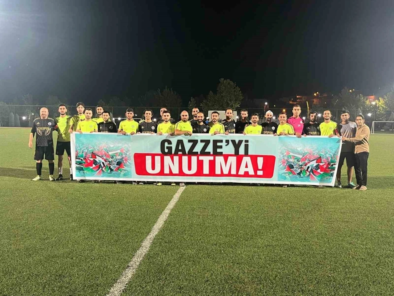 Diyarbakır’ın Çınar Kaymakamlığı tarafından düzenlenen 29 Ekim Cumhuriyet Futbol Turnuvasında sahaya çıkan takımlar ‘Gazze’yi Unutma’ pankartı açarak İsrail’in Filistin’de gerçekleştirdiği soykırıma tepki gösterdi.