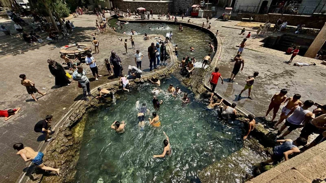 Diyarbakır’da sıcaktan bunalan çocuklar ve aileleri, soluğu süs havuzunda alarak serinlemeye çalışıyor.